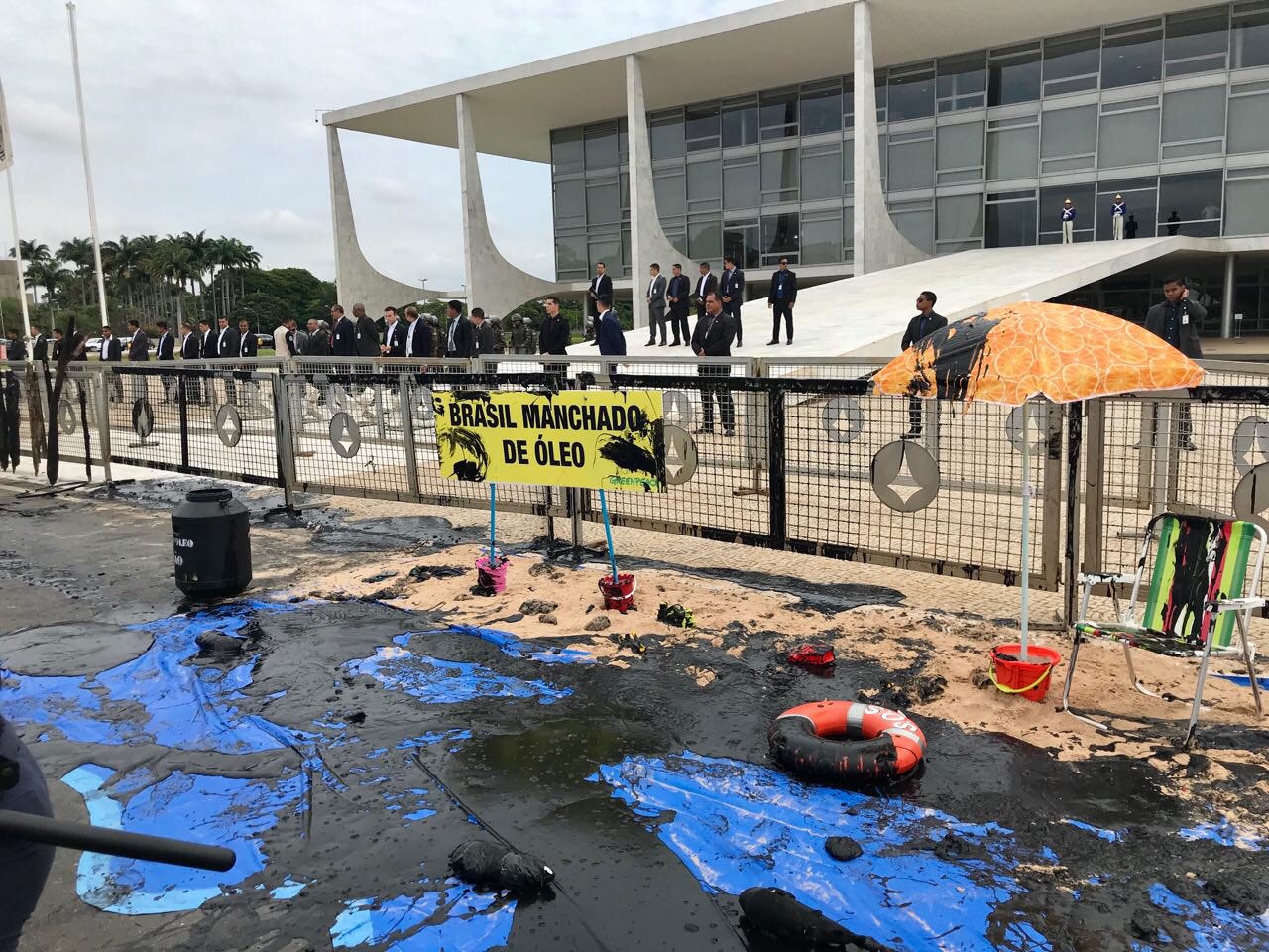 Frente do Palácio do Planalto amanhece cheia de óleo. 'Artivismo' do @GreenpeaceBR é em protesto ao descaso do governo federal com o derramamento de óleo que atinge em larga escala o litoral nordestino. Será que agora Bolsonaro enxergará o problema?#Equipe