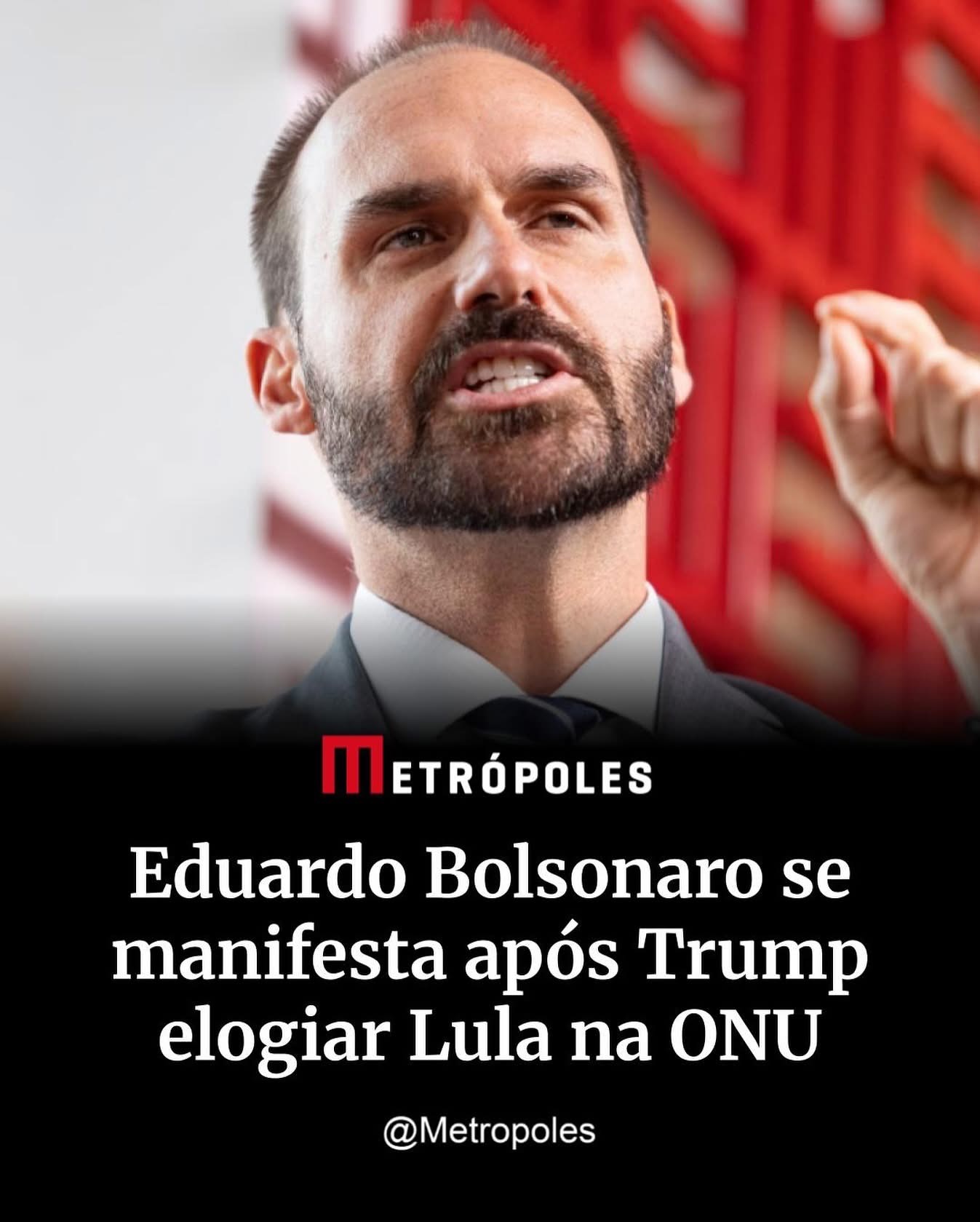 O deputado federal Eduardo Bolsonaro (PL-SP) reagiu, nesta terça-feira (23/9), ao discurso do presidente dos Estados Unidos (EUA) Donald Trump na abertura da 80ª Assembleia Geral da Organização das Nações Unidas (ONU), no qual o norte-americano elogiou o presidente Luiz Inácio Lula da Silva (PT).