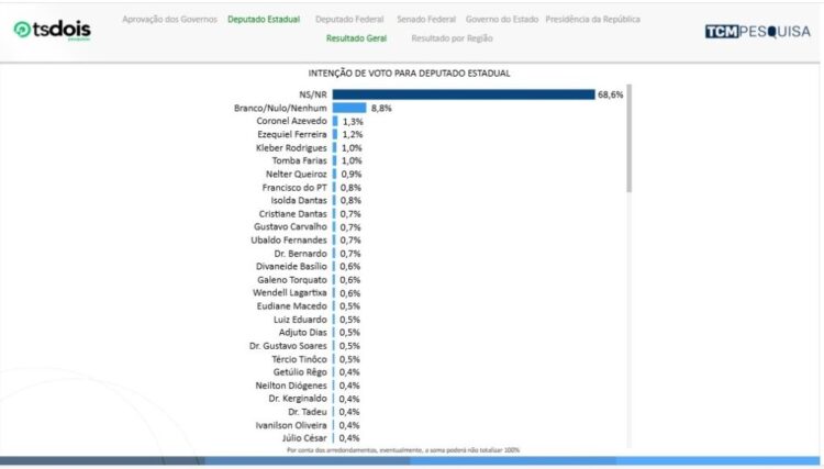 A TCM divulgou nesta quarta-feira os números da pesquisa TS2 para deputado estadual que tem Coronel Azevedo (PL) e Ezequiel Ferreira de Souza (PSDB) como os mais citados.