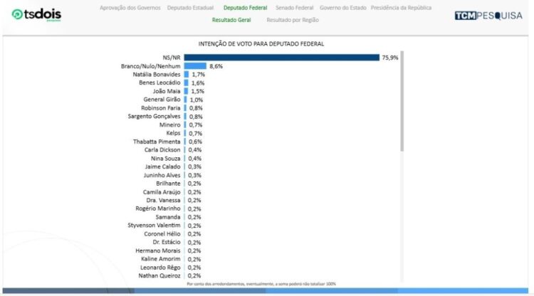 A petista tem 1,7% seguida por Benes Leocádio (UB) com 1,6%, João Maia (PP) com 1,5%. Na sequência aparece General Girão (PL) com 1,0%, Robinson Faria (PP) e Sargento Gonçalves (PL) com 0,8%.