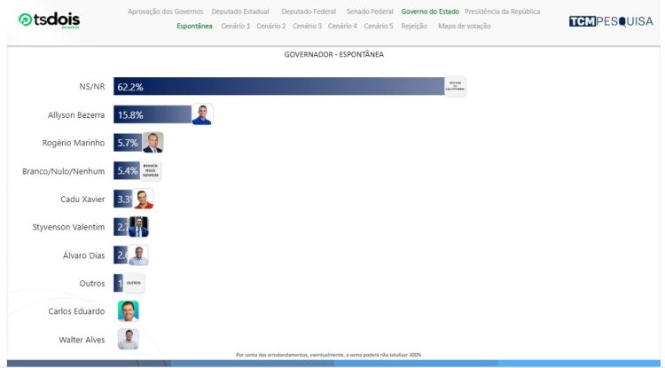 Na pesquisa espontânea, não sabem ou não responderam são 73,5%. Styvenson Valentim aparece com 9,8%. Branco/nulo/nenhum são 6,4%. Fátima Bezerra tem 5,5%. Zenaide Maia 2,4%. Álvaro Dias 0,9%, Babá Pereira 0,5%, Outros 0,5%, Coronel Hélio 0,3% e Carlos Eduardo 0,2%.
