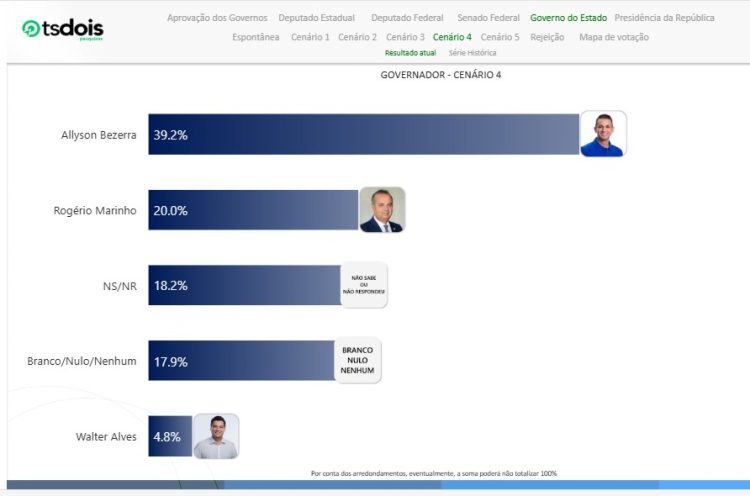 A pesquisa TS2 ouviu 1.831 eleitores em 68 municípios do Rio Grande do Norte entre os dias 21, 22, 23 e 24 de outubro. A margem de erro de 2,3 pontos percentuais para mais ou para menos com nível de confiança de 95%.