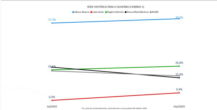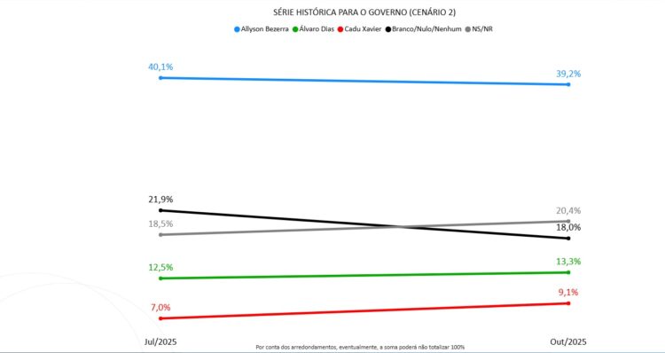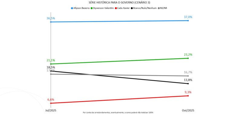 O prefeito de Mossoró Allyson Bezerra (UB) oscilou positivamente dentro da margem de erro de 2,3 pontos percentuais para mais ou para menos em três dos quatro cenário com série histórica. Só oscilou negativamente em um deles.
