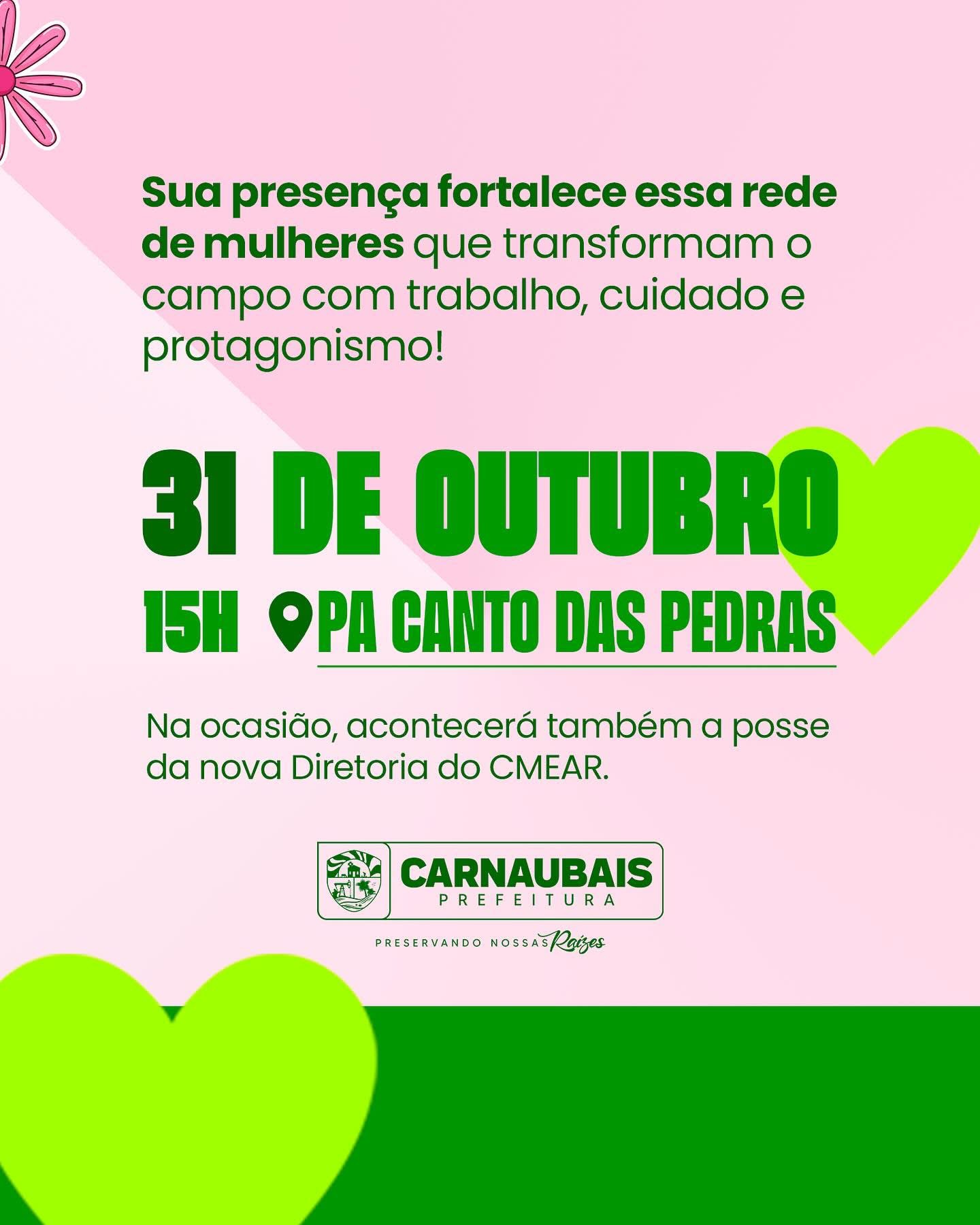 Hoje, 31/10, às 15h, no Assentamento Canto das Pedras, teremos uma tarde de cuidado, informação e valorização da mulher. 🌸