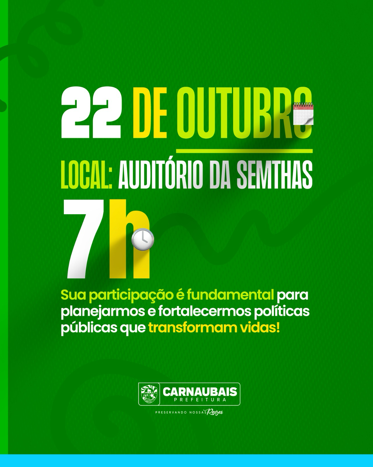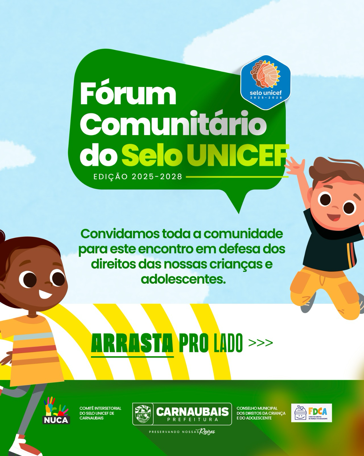 A Comissão Intersetorial do Selo UNICEF e o Conselho Municipal dos Direitos da Criança e do Adolescente – CMDCA, com o apoio da Prefeitura Municipal de Carnaubais, têm a alegria de convidar você para participar do nosso FÓRUM COMUNITÁRIO DO SELO UNICEF.