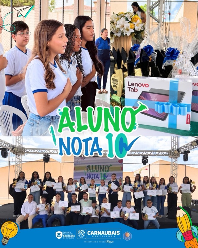 A Prefeitura de Carnaubais, por meio da Secretaria Municipal de Educação, realizou hoje o evento Aluno Nota 10, um momento de orgulho, gratidão e honra para reconhecer os alunos que se destacaram na Rede Municipal de Ensino.