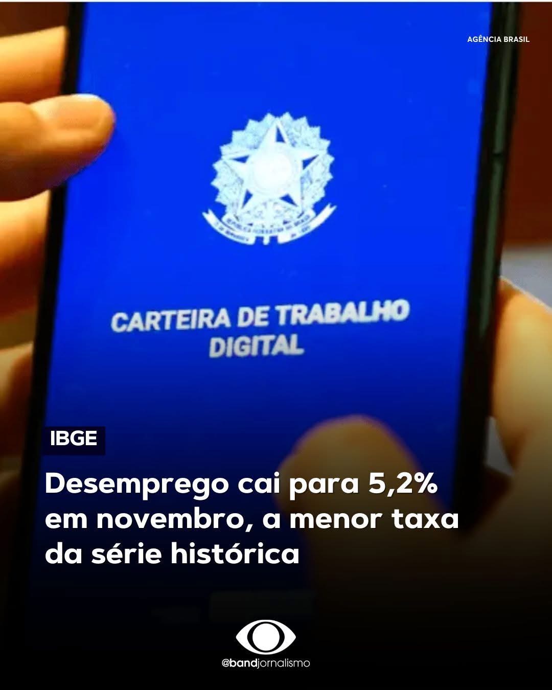 A taxa de desemprego no país ficou em 5,2% no trimestre encerrado em novembro, segundo a Pesquisa Nacional por Amostra de Domicílios Contínua (PNAD Contínua). O índice foi divulgado nesta terça-feira (30) pelo Instituto Brasileiro de Geografia e Estatística (IBGE).