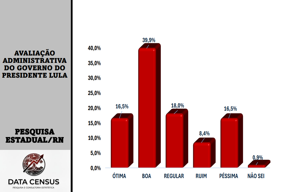 Em contrapartida, a rejeição somada (Ruim/Péssimo) fica em 24,9%. O equilíbrio dos dados mostra que, para cada potiguar que desaprova a gestão federal, existem mais de dois que a avaliam positivamente.