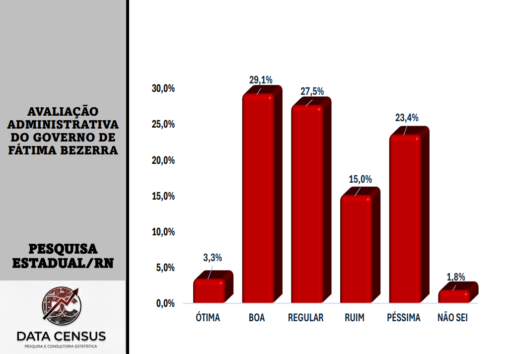 A situação da governadora Fátima Bezerra é mais complexa. A soma de Ótimo/Bom chega a 32,4%, um número impulsionado principalmente pela avaliação “Boa” (29,1%), já que a avaliação “Ótima” registra apenas 3,3%.
