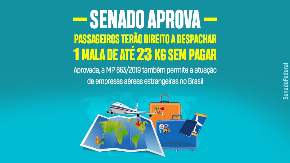 O Senado aprovou a MP 863/2019, que inclui emenda garantindo ao passageiro o direito de despachar 1 mala de até 23 kg em viagens aéreas. A MP também permite até 100% de capital estrangeiro nas empresas aéreas que operarem no país.