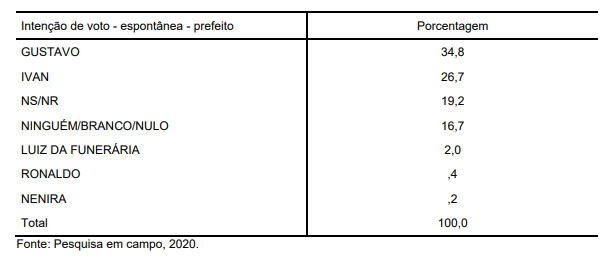 Em segundo aparece o ex-prefeito Ivan júnior com 26,7% das intenções de Voto. O total de indecisos foi de 19,2%. Brancos e nulos somaram 16,7%. Luiz da Funerária ainda foi citado por 2% dos eleitores. Os demais nomes não atingiram 1%, cada.
