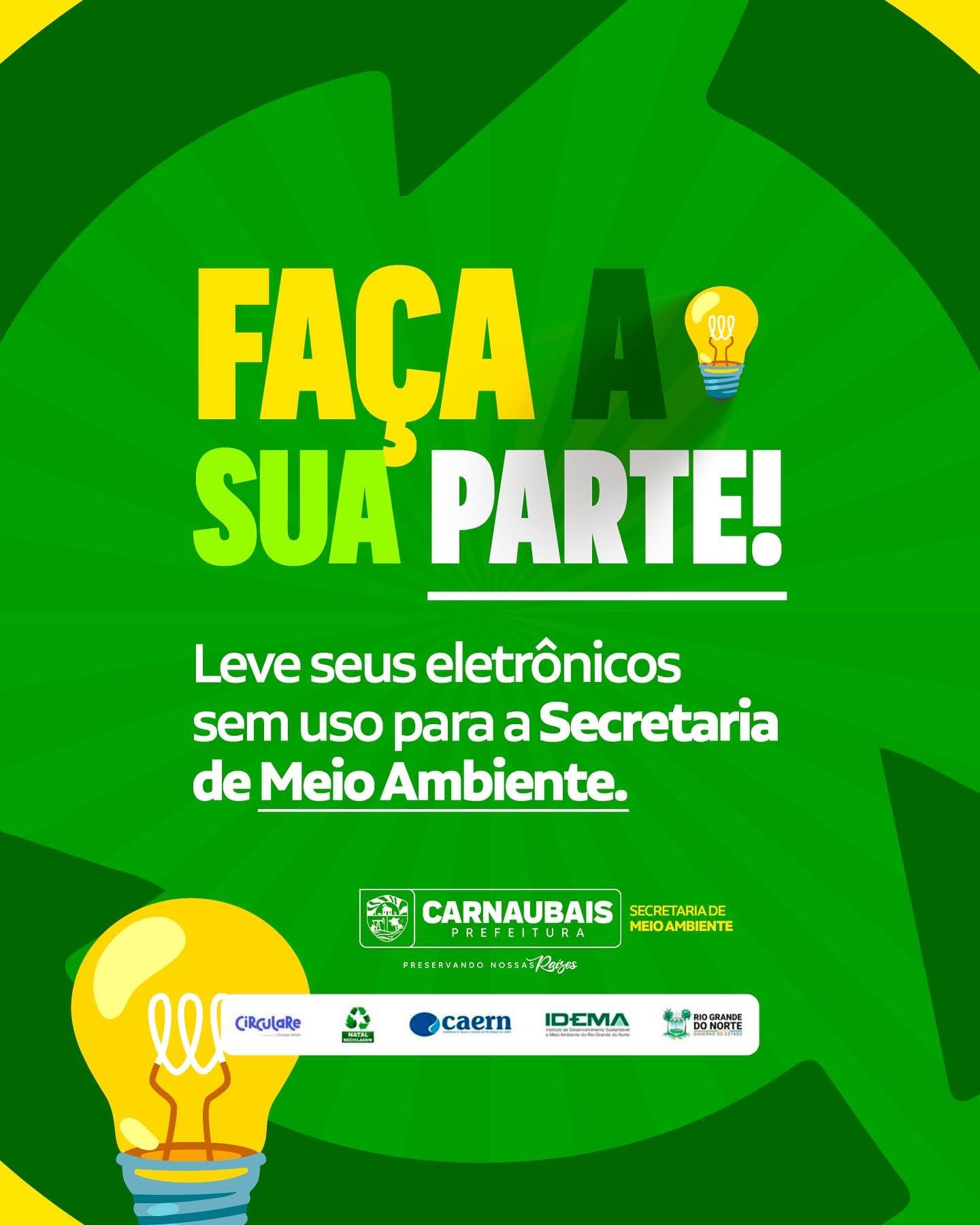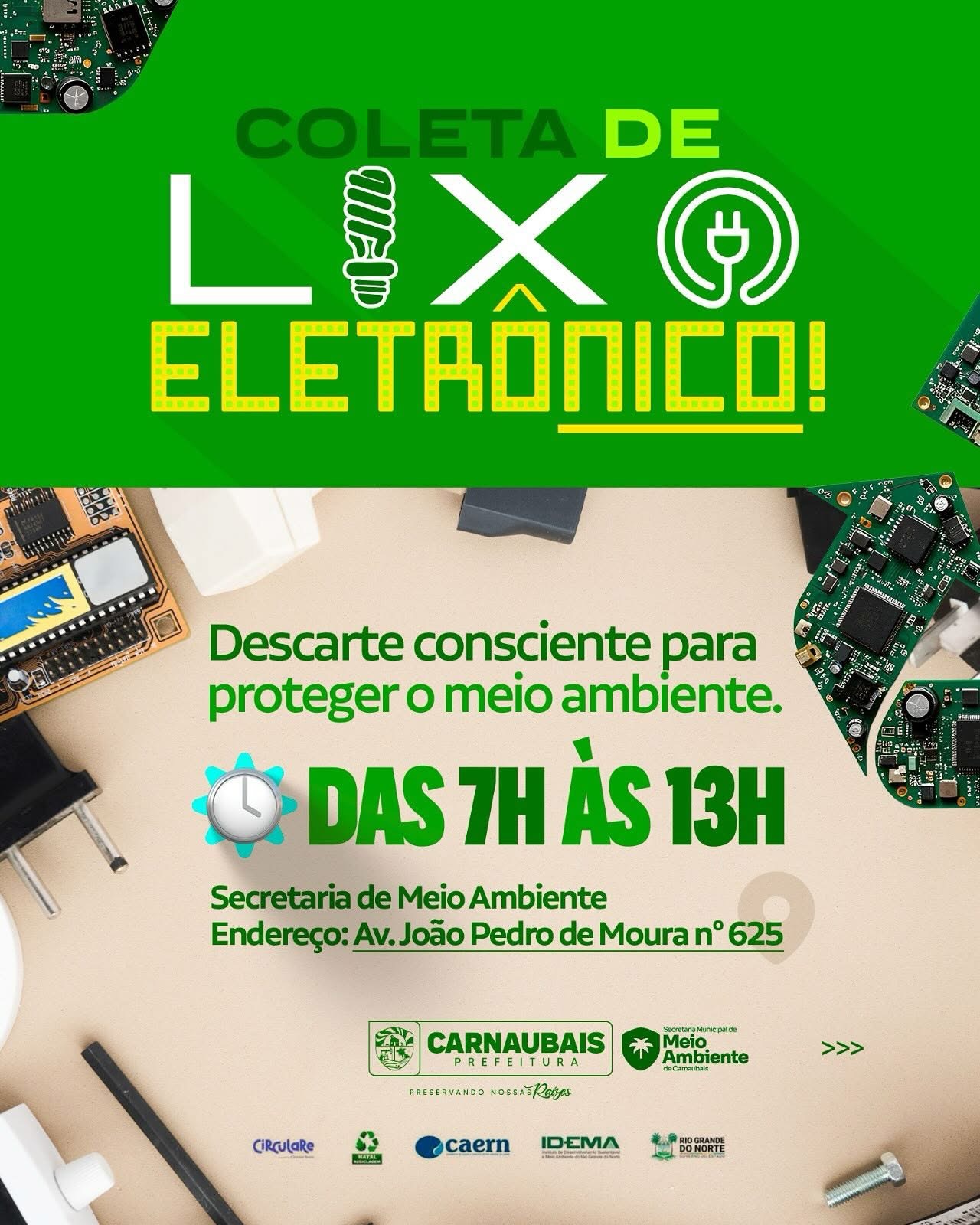 A Prefeitura Municipal, por meio da Secretaria de Meio Ambiente, está realizando a coleta de eletrônicos, das 7h às 13h, com apoio dos nossos parceiros.