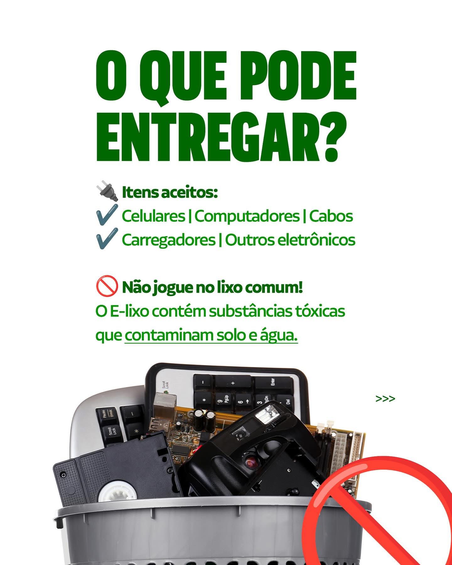🔌 Você pode entregar: celulares, computadores, cabos, carregadores e outros eletrônicos.