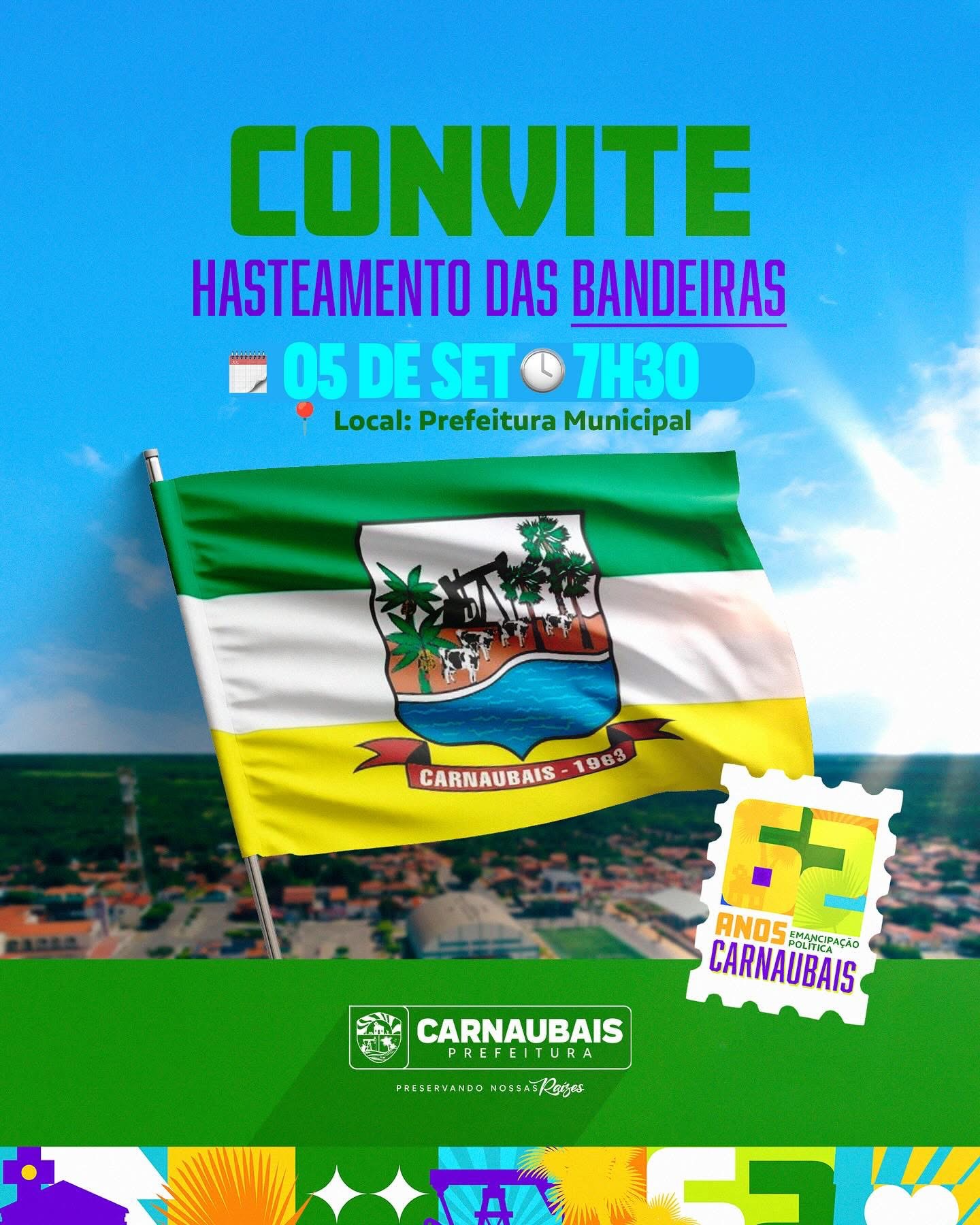 A Prefeitura Municipal de Carnaubais convida toda a população para participar do Hasteamento das Bandeiras, em celebração aos 62 anos da nossa Emancipação Política.