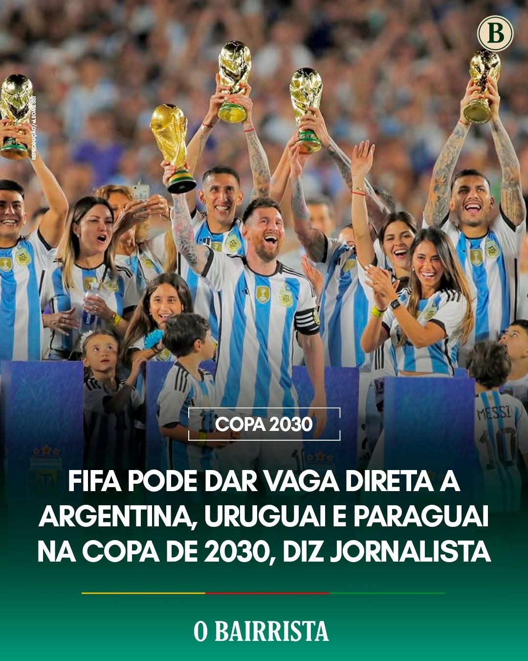 🏆 A FIFA estuda conceder classificação automática para Argentina, Uruguai e Paraguai na Copa do Mundo de 2030. Os três países receberão partidas inaugurais do torneio e, por isso, podem ser dispensados das Eliminatórias Sul-Americanas.