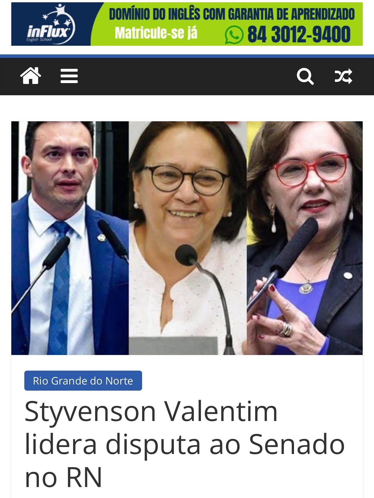O senador Styvenson Valentim (Podemos) aparece na liderança da corrida eleitoral para o Senado no Rio Grande do Norte, segundo levantamento realizado entre os dias 6 e 11 de setembro. O parlamentar soma 38,0% das intenções de voto, abrindo vantagem sobre os demais concorrentes.
