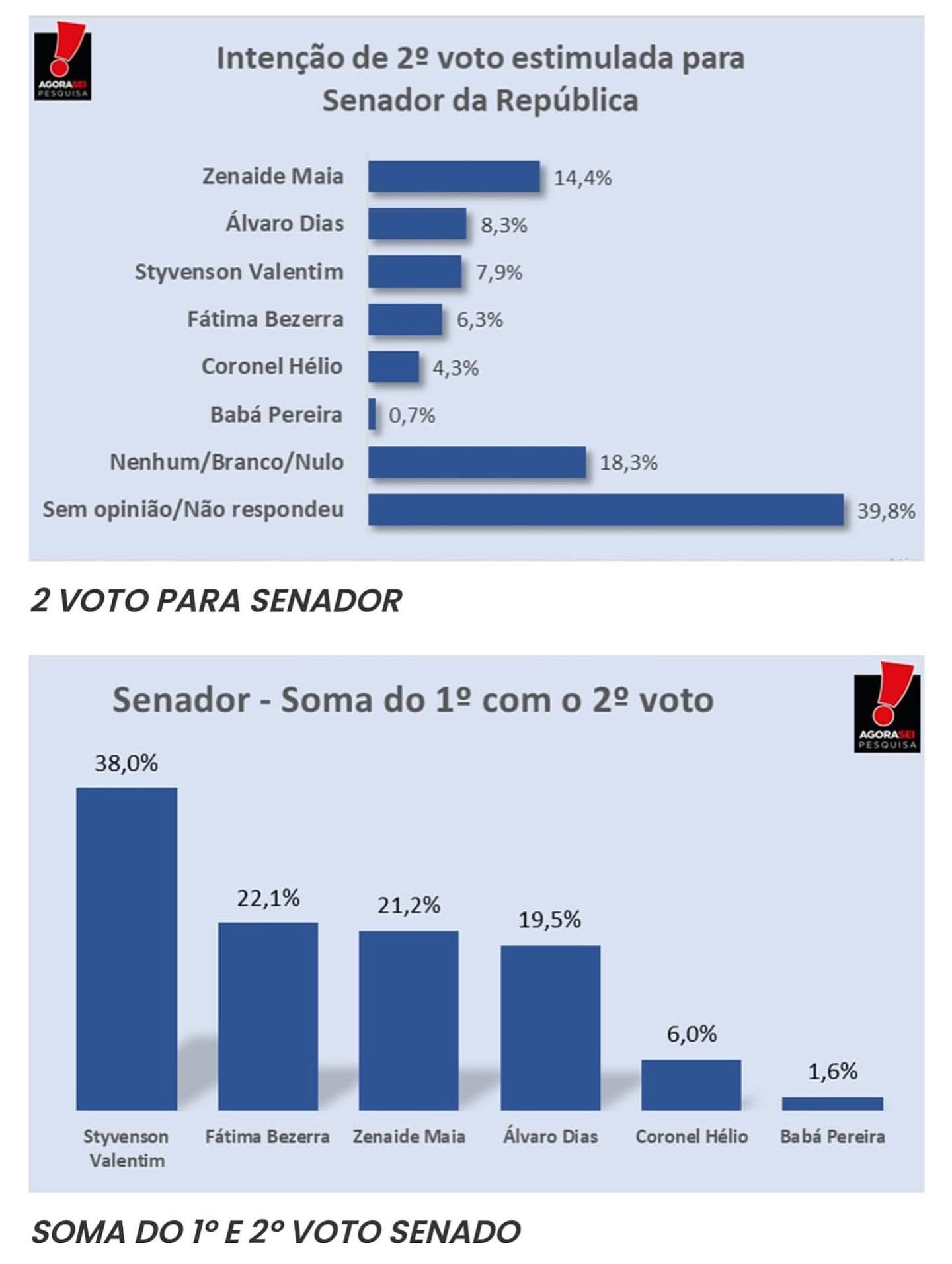Na segunda colocação, há um empate técnico entre a ex-governadora Fátima Bezerra (PT), com 22,1%, e a atual senadora Zenaide Maia (PSD), que registrou 21,2%.