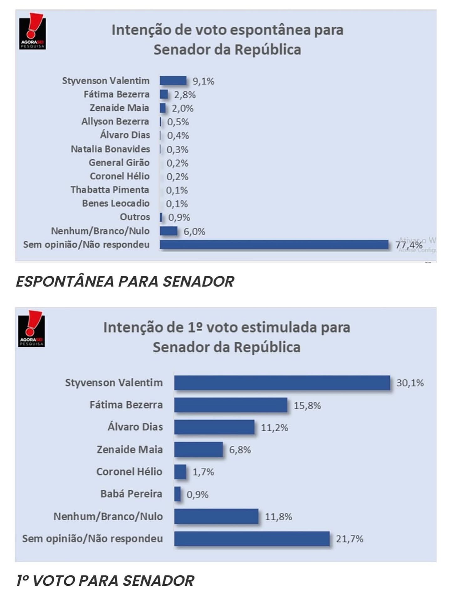 O prefeito de Natal, Álvaro Dias (Republicanos), figura logo em seguida com 19,5%. Já o coronel Hélio (PL) aparece com 6,0%, e Babá Pereira tem 1,6% das intenções de voto.