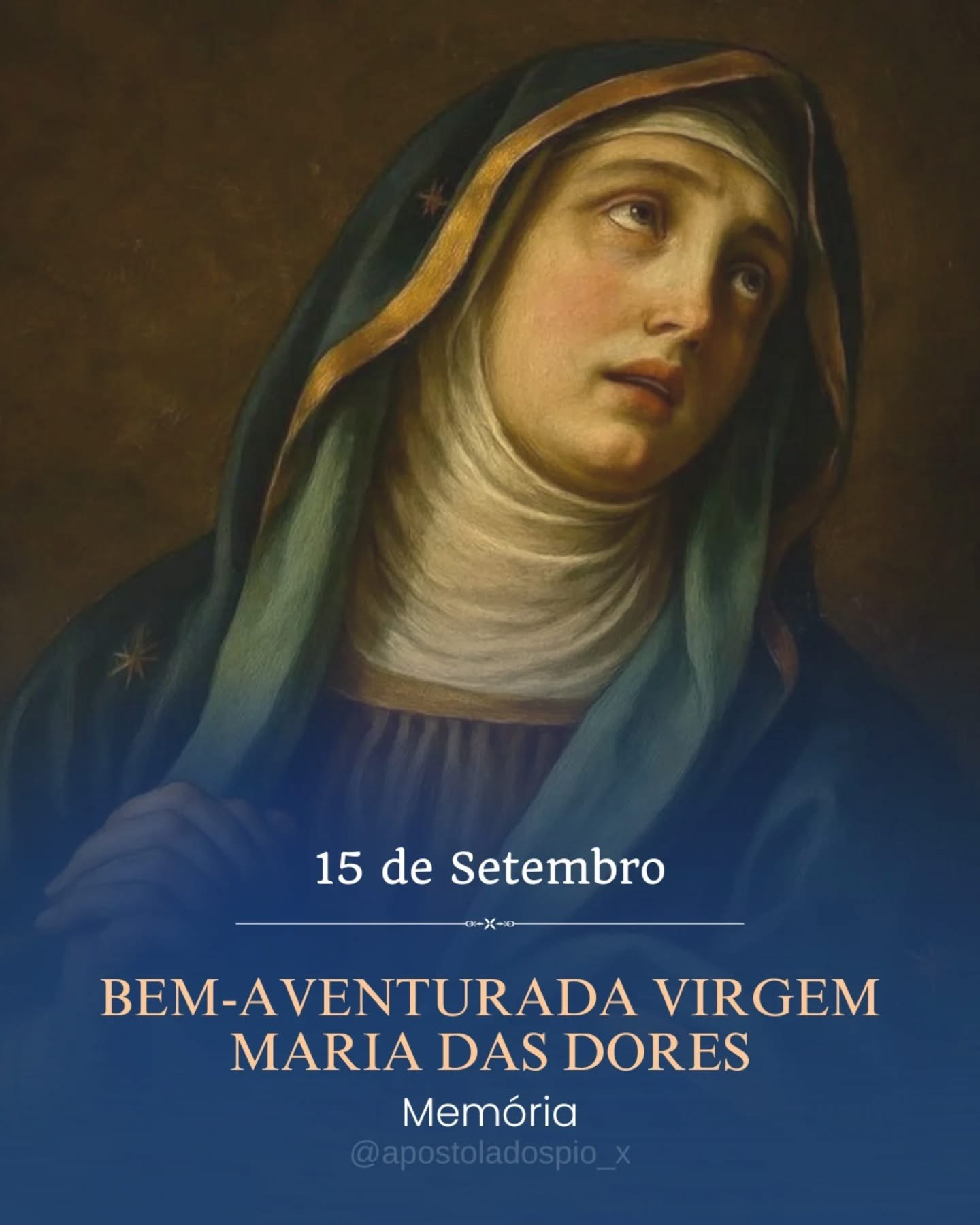 Assim, a Igreja reza a Maria neste dia, pois celebramos sua compaixão, piedade; suas sete dores cujo ponto mais alto se deu no momento da crucificação de Jesus. Esta devoção deve-se muito à missão dos Servitas – religiosos da Companhia de Maria Dolorosa – e sua entrada na Liturgia aconteceu pelo Papa Bento XIII.