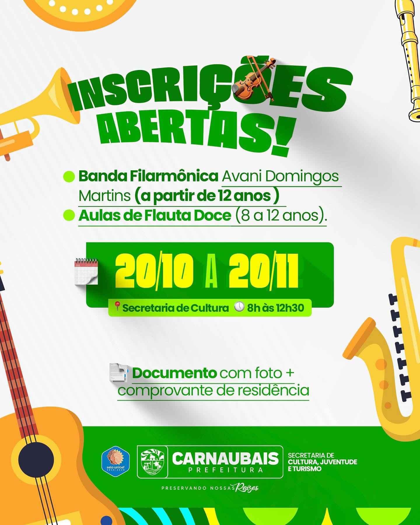 Estão abertas as inscrições para a Banda Municipal Filarmônica Avani Domingos (a partir de 12 anos) e para as Aulas de Flauta Doce (crianças de 8 a 12 anos).