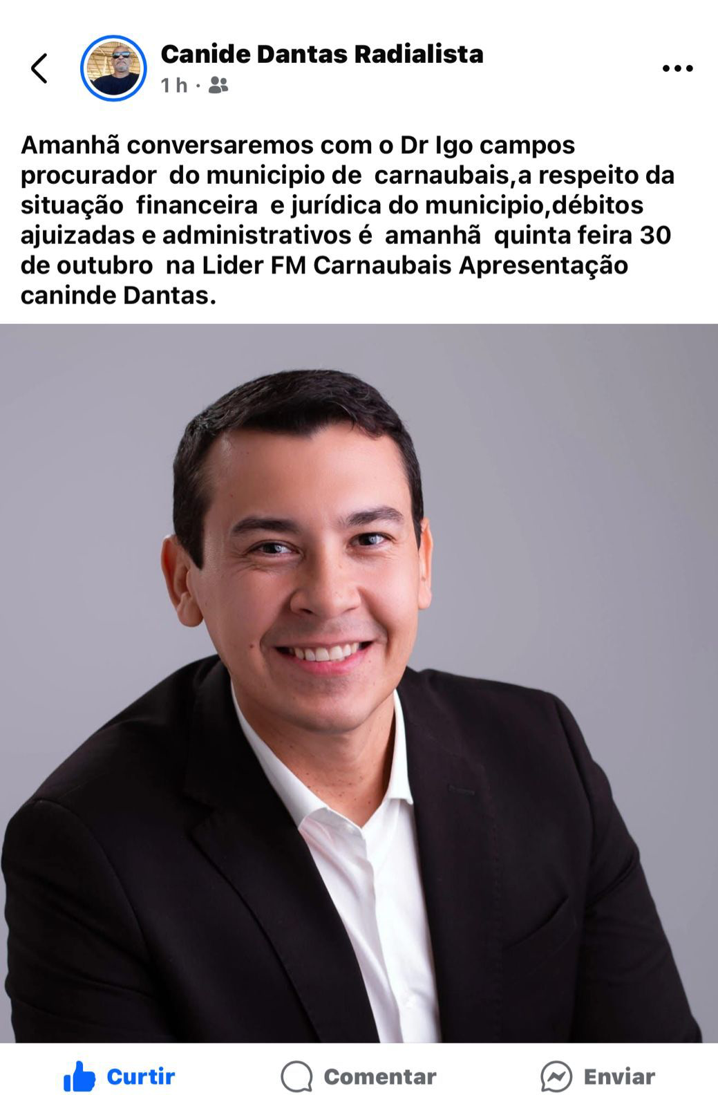 Amanhã na líder FM o radialista Canide Dantas, vai entrevistar o procurador do município DR Igor Campos!