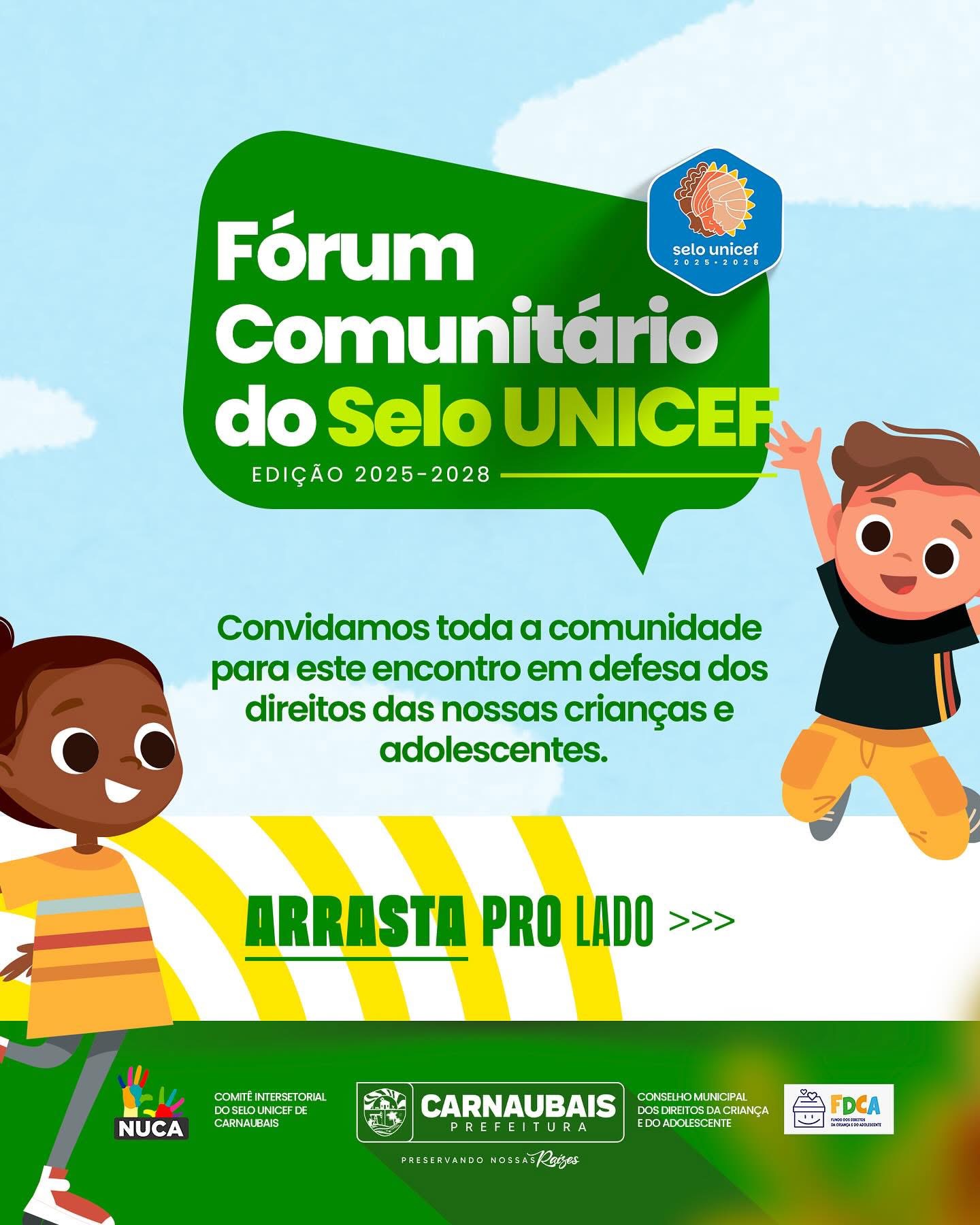 A Comissão Intersetorial do Selo UNICEF e o Conselho Municipal dos Direitos da Criança e do Adolescente – CMDCA, com o apoio da Prefeitura Municipal de Carnaubais, têm a alegria de convidar você para participar do nosso FÓRUM COMUNITÁRIO DO SELO UNICEF.