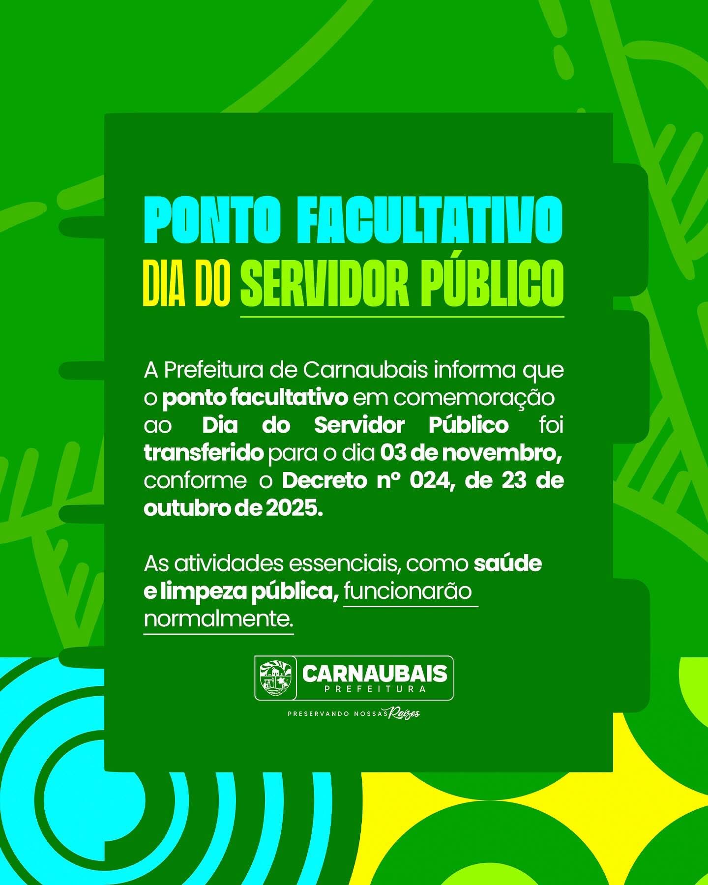 A Prefeitura Municipal de Carnaubais informa que o ponto facultativo em comemoração ao Dia do Servidor Público foi transferido para o dia 03 de novembro de 2025, conforme o Decreto nº 024, de 23 de outubro de 2025.