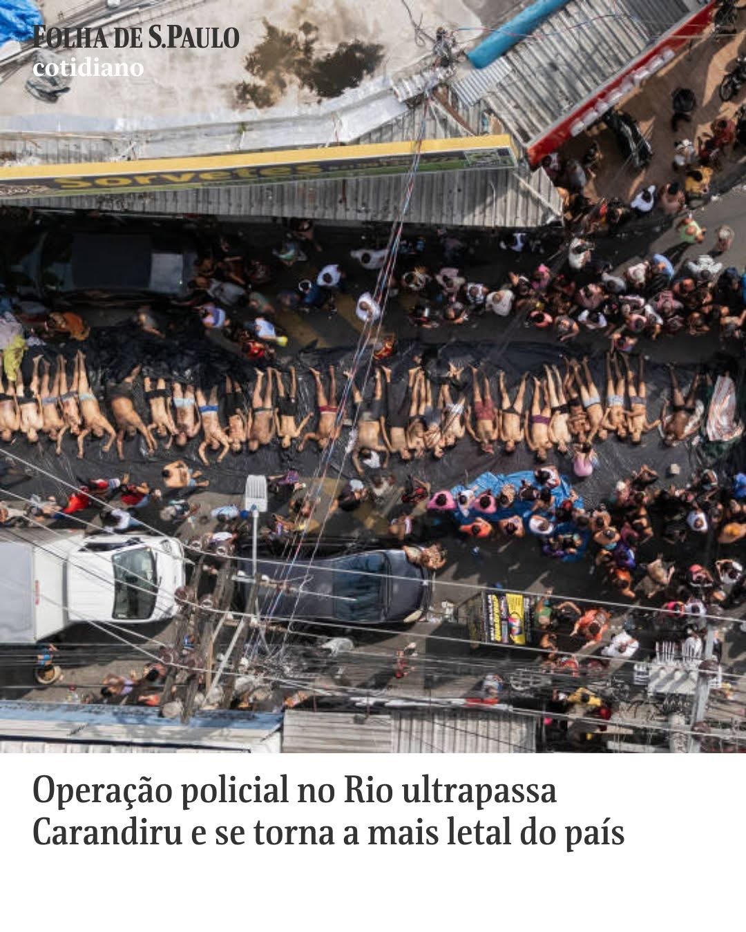 #PraTodosVerem: Vista aérea mostra dezenas de corpos posicionados lado a lado no meio de uma rua, cercadas por um grupo maior de manifestantes em pé. A cena ocorre em área urbana, em favela na zona norte do Rio de Janeiro, durante o dia. Abaixo, a chamada informa: "Operação policial no Rio ultrapassa Carandiru e se torna a mais letal do país".