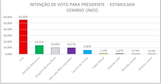 Lula tem 55,33% contra 23,99%. Isso dá 31,34 pontos percentuais de vantagem sobre a soma de todos os adversários juntos.