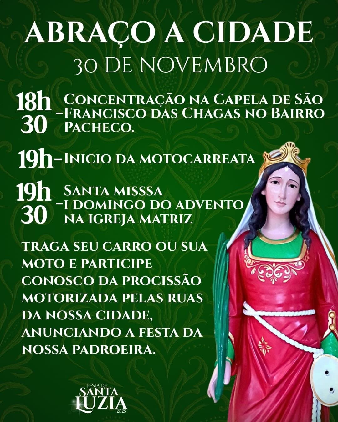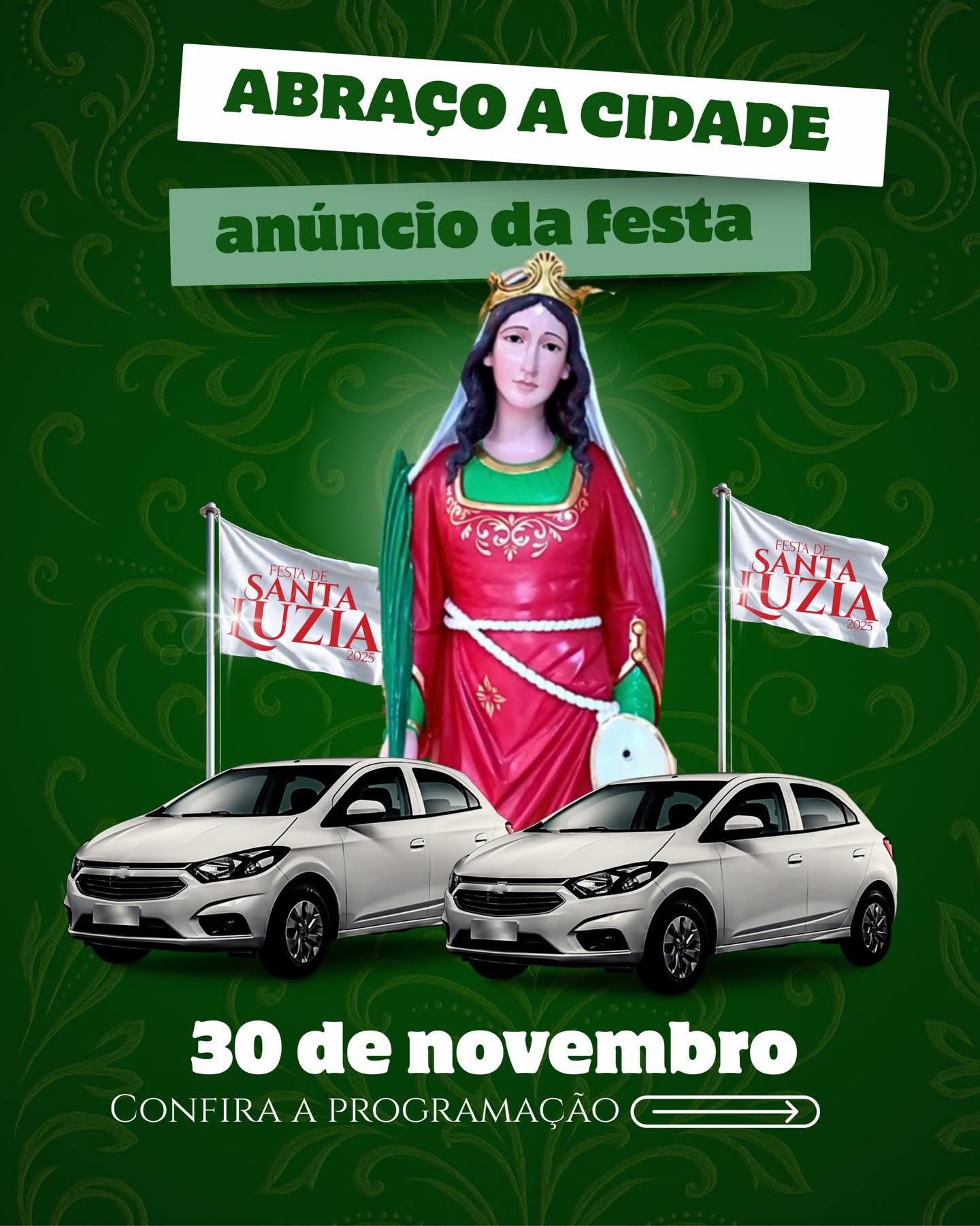 Amanhã… 30 de novembro, nossa cidade se une em fé e alegria no grande Abraço à Cidade e no anúncio oficial da Festa de Santa Luzia 2025! 🙏✨