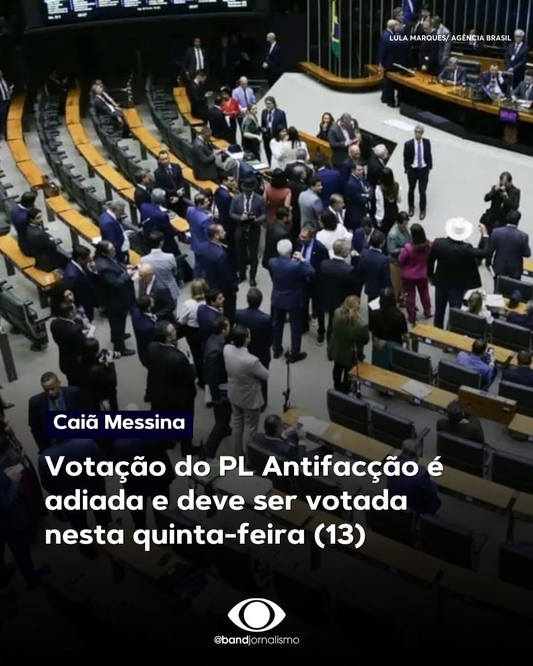Em conversa com o jornalismo da Band, o relator do PL Antifacção, Guilherme Derrite, e integrantes da mesa disseram que a votação do projeto foi adiada, a princípio para quinta-feira (13).
