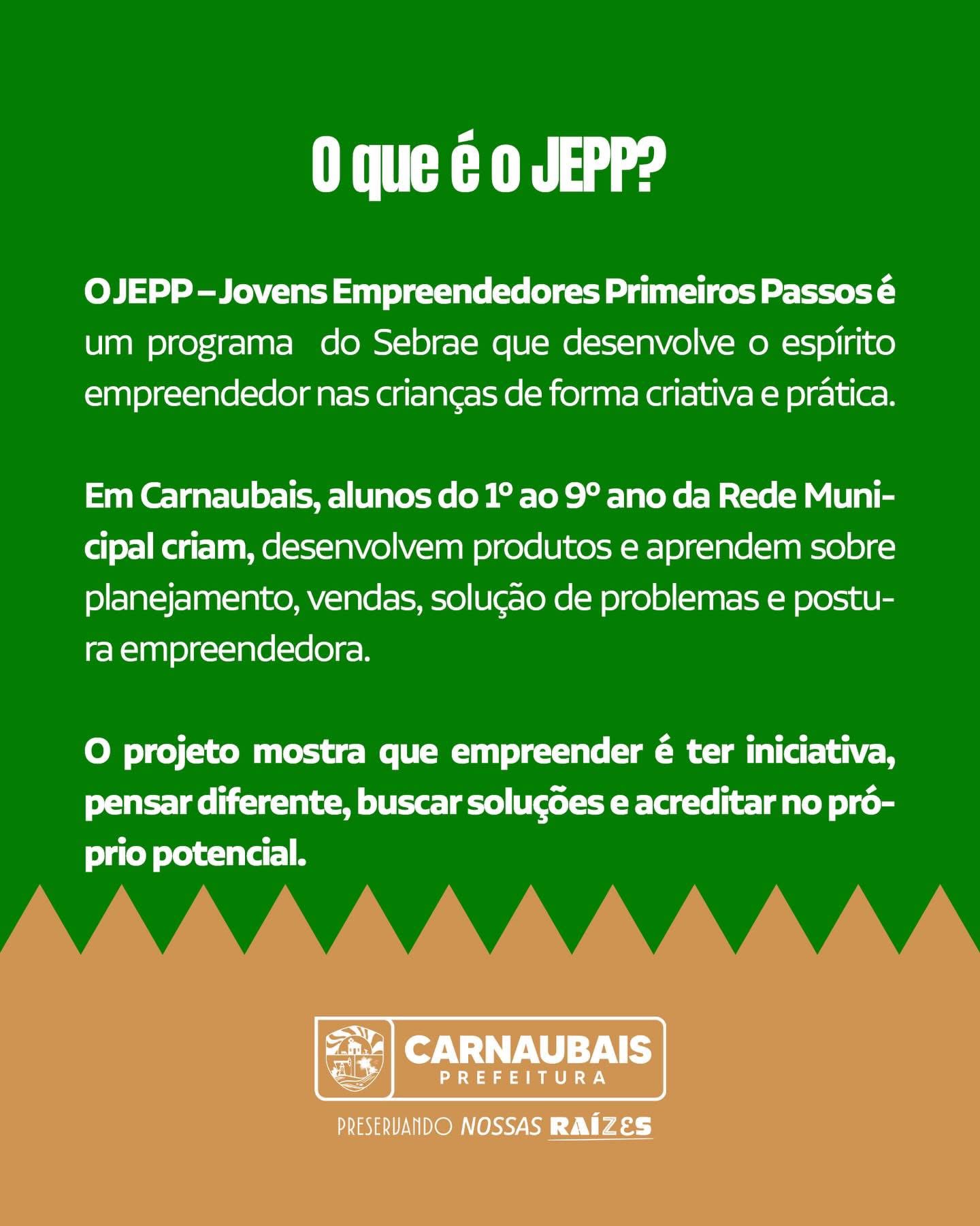 A Prefeitura de Carnaubais, por meio da Secretaria de Educação, em parceria com o Sebrae, está realizando o JEPP – Jovens Empreendedores Primeiros Passos, programa que desenvolve o olhar empreendedor dos estudantes de forma criativa e prática.
