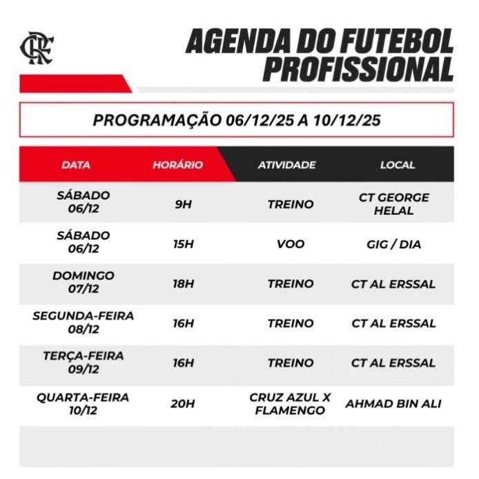 O Flamengo divulgou a agenda da semana, que inclui a viagem para o Catar e o duelo com o Cruz Azul pela Copa Intercontinental. Confira:
