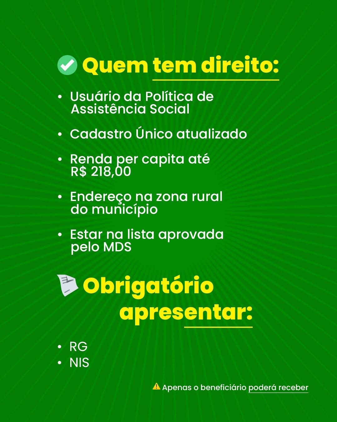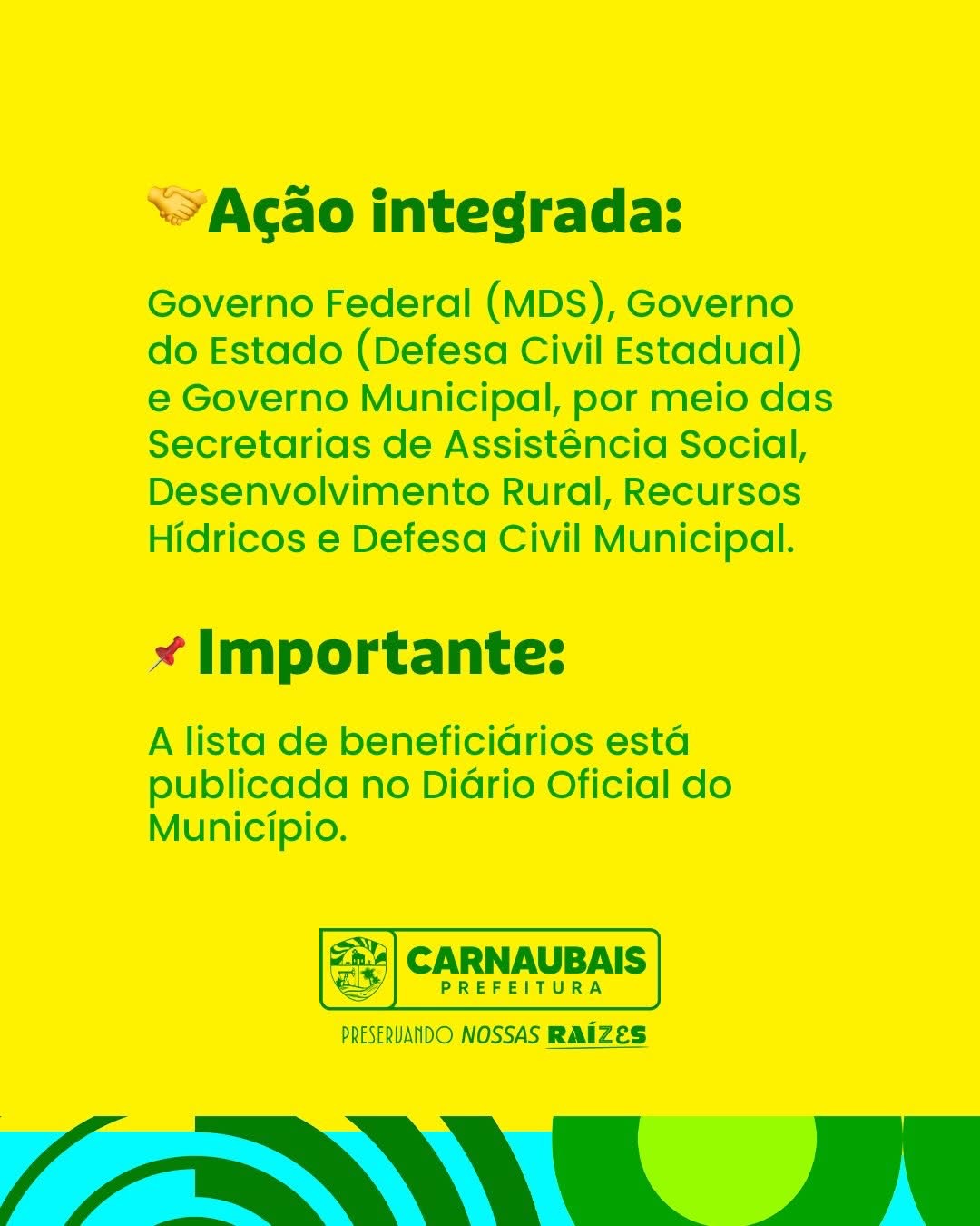 🤝 Ação integrada entre o Governo Federal (MDS), Governo do Estado (Defesa Civil Estadual) e o Governo Municipal, por meio das Secretarias de Assistência Social, Desenvolvimento Rural, Recursos Hídricos e Defesa Civil Municipal.