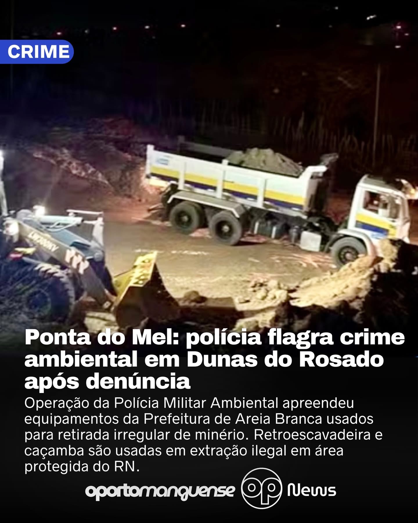 A Polícia Militar Ambiental flagrou, uma extração irregular de areia dentro da Área de Proteção Ambiental (APA) Dunas do Rosado, em Areia Branca, no litoral do Rio Grande do Norte. A ação criminosa ocorreu na comunidade Ponta do Mel e caracteriza crime ambiental.