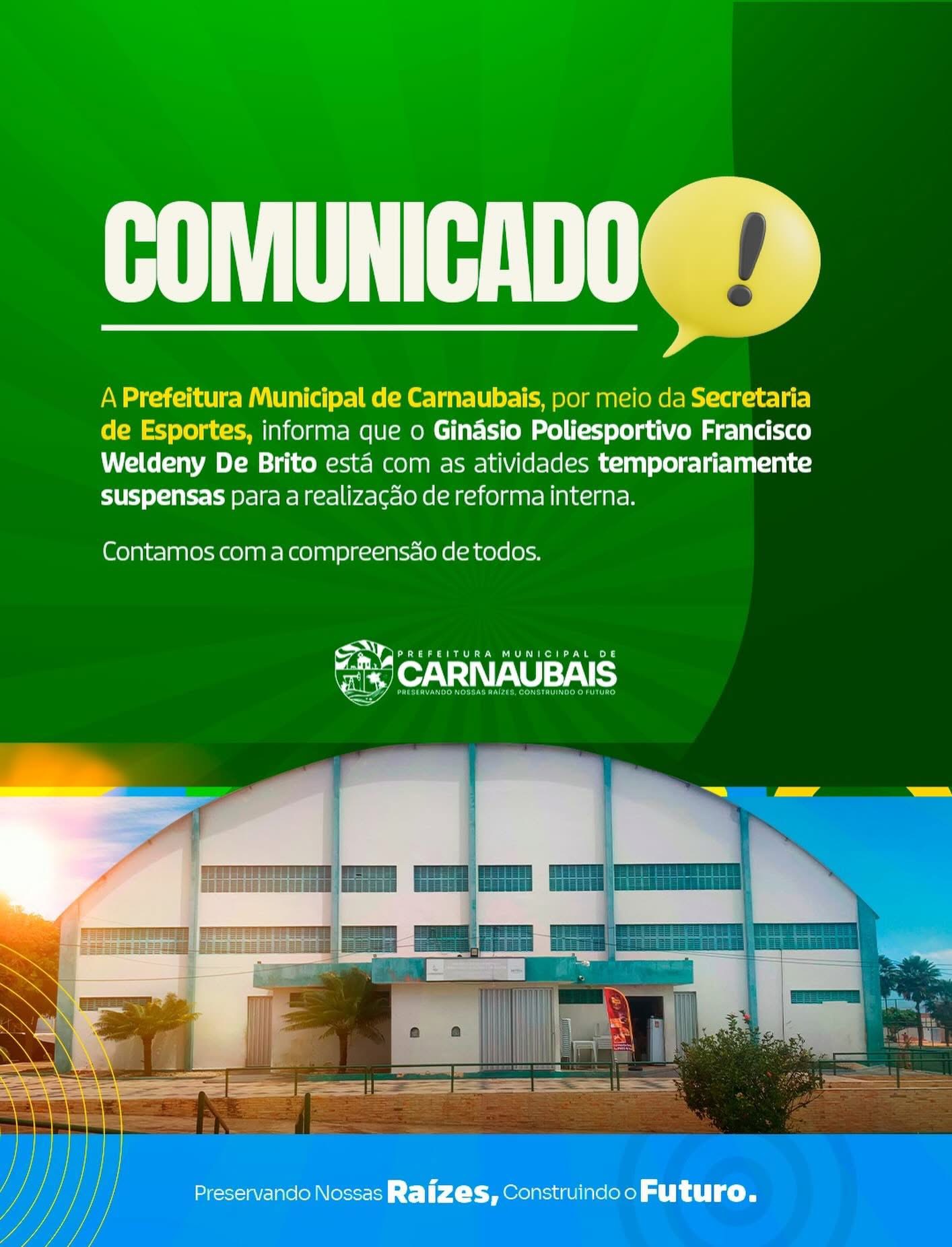 A Prefeitura Municipal de Carnaubais, por meio da Secretaria de Esportes, informa que o Ginásio Poliesportivo Francisco Weldeny De Brito está com as atividades temporariamente suspensas para a realização de reforma interna.