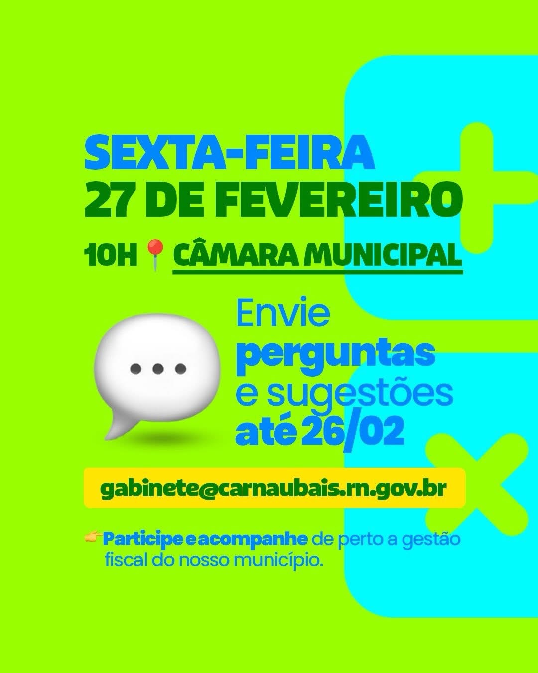 A população também pode enviar perguntas e sugestões até 26/02 pelo e-mail: gabinete@carnaubais.rn.gov.br