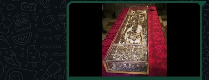 Desde 1978, os restos mortais estavam guardados em um relicário transparente dentro de um cofre metálico na cripta da Basílica - o esqueleto pequeno e com o crânio danificado desde o século.XII - repousa sobre um tecido de seda branca.
