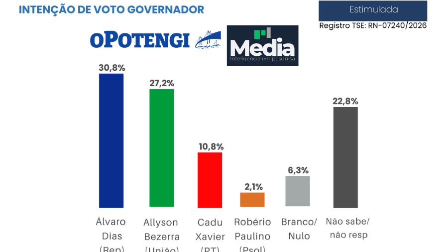 A primeira fotografia mais ampla da corrida pelo Governo do Rio Grande do Norte em 2026 mostra um cenário de pré-campanha já configurado, mas ainda longe de definição. Na pesquisa Media/O Potengi estimulada, em que os nomes dos pré-candidatos são apresentados ao entrevistado, Álvaro Dias (PL) aparece com 30,8% das intenções de voto, seguido por Allyson Bezerra (UP), com 27,2%. Como a diferença entre os dois está dentro da margem de erro de 2,2 pontos percentuais para mais ou para menos, o quadro é de empate técnico na liderança. Em seguida vêm Cadu Xavier (PT), com 10,8%, e Robério Paulino, com 2,1%. Brancos e nulos somam 6,3%, enquanto 22,8% disseram não saber ou preferiram não responder.