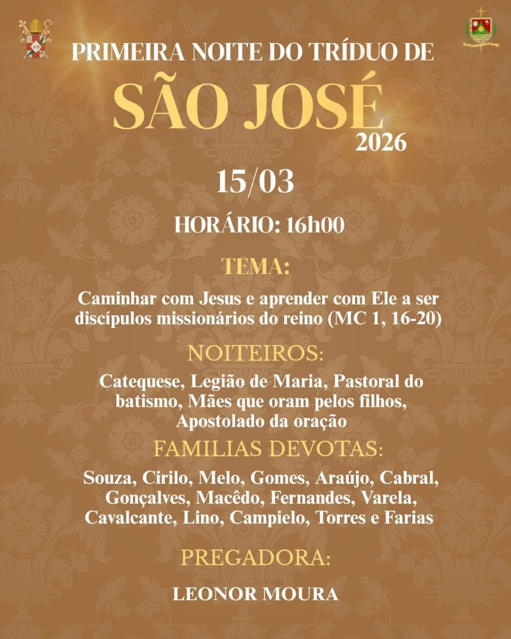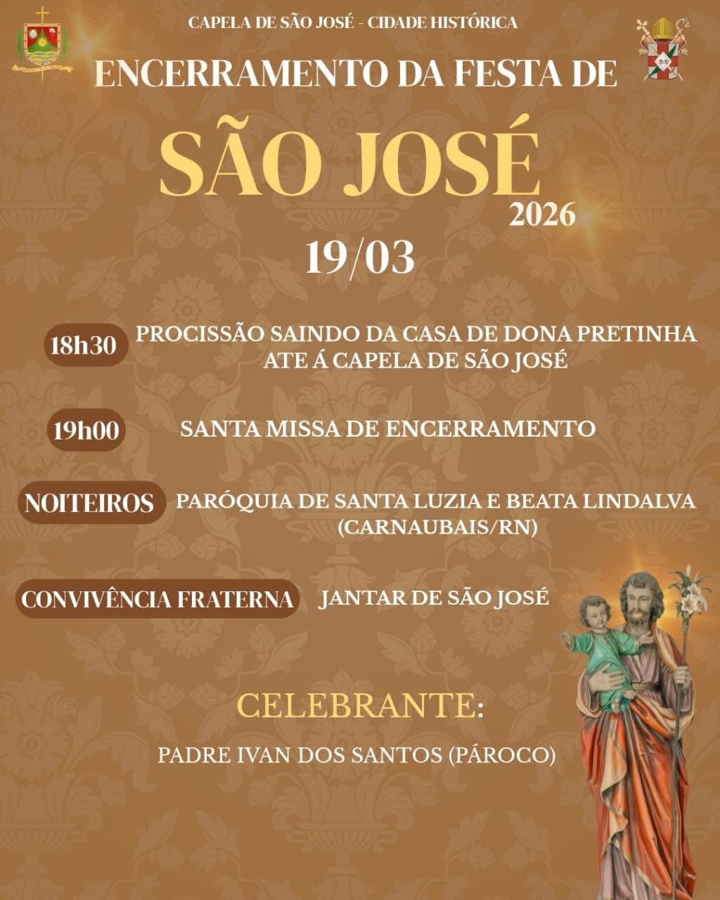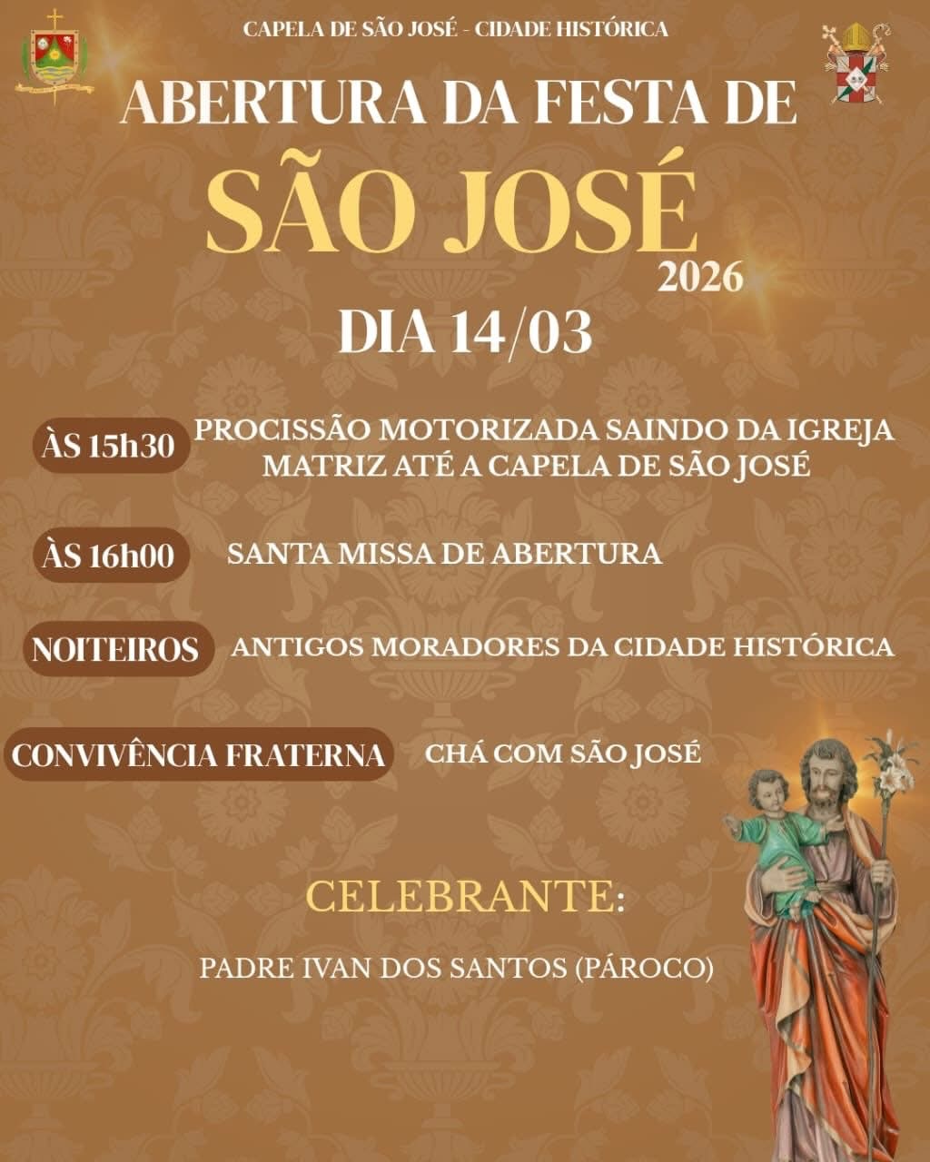 🚨apenas a abertura e o encerramento da festa de São José na capela da Cidade Histórica. Noites do Tríduo na Igreja Matriz