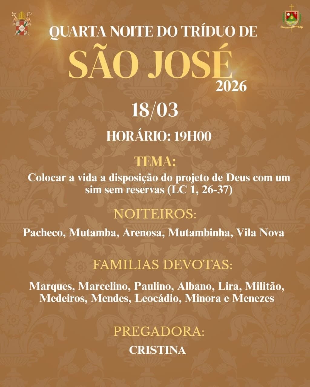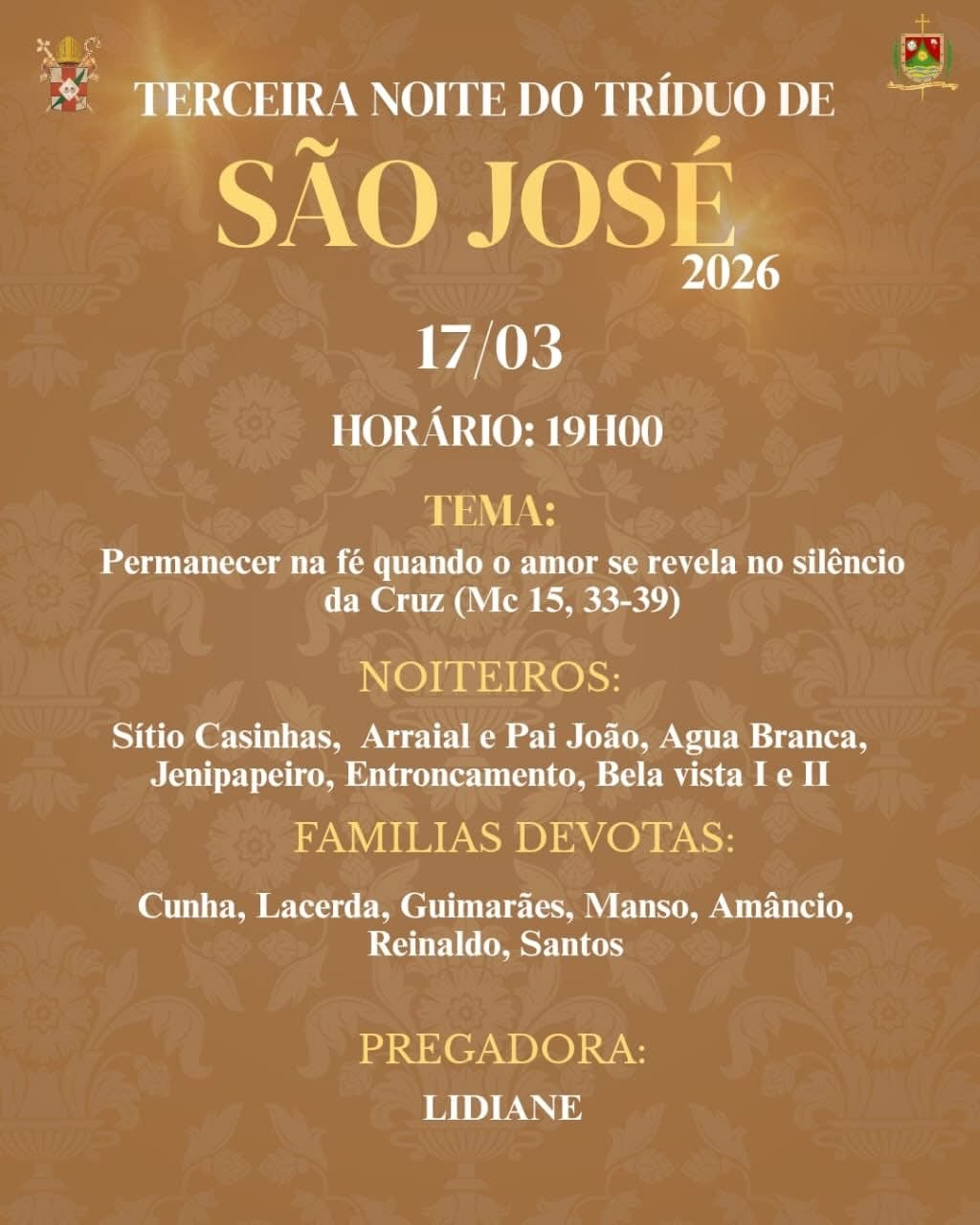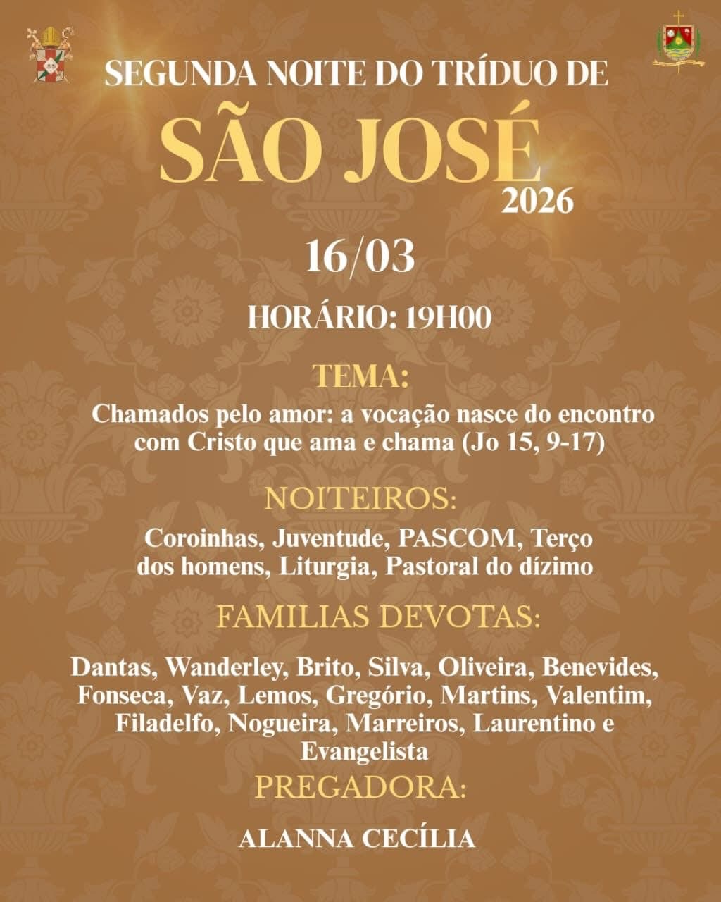 🚨apenas a abertura e o encerramento da festa de São José na capela da Cidade Histórica. Noites do Tríduo na Igreja Matriz